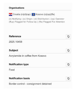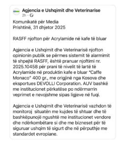 Një njoftim alarmi është publikuar nga sistemi RASFF i Komisionit Evropian, ku raportohet se kafeja “Prince Caffe” e Devolli Corporation ka rezultuar me prani të akrilamideve në Kroaci. Alerti është bërë publik gjithashtu edhe nga Agjencia e Ushqimit dhe Veterinarisë së Kosovës (AUVK).